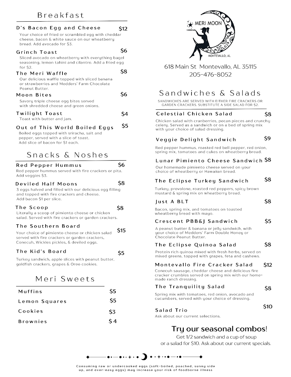 The menu at Meri Moon is organized into several well-defined sections, offering options suitable for breakfast, light meals, and snacks throughout the day. Visitors can expect a variety of choices ranging from classic breakfast dishes to sandwiches, salads, and sweets.